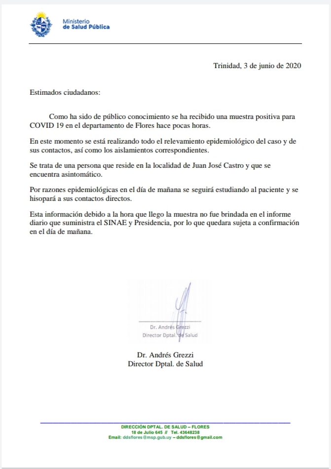 En la noche de ayer el Ministerio de Salud Pública a través de una carta del Director Departamental de Salud Dr. Andrés Grezzi, se confirmó un caso de positivo para COVID-19 de un residente de Juan José Castro.