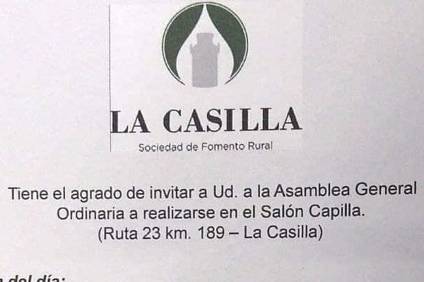 El viernes 15 de noviembre se estará celebrando una Asamblea General Ordinaria en el Salón Capilla por parte de la Sociedad de Fomento Rural La Casilla.