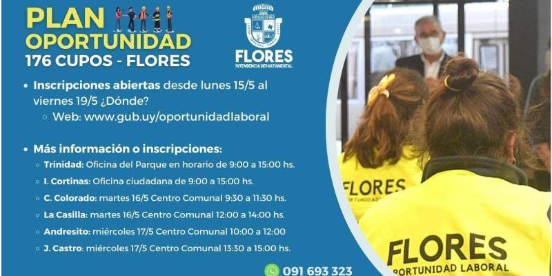 La Intendencia Departamental de Flores cuenta con 176 vacantes para el Plan Oportunidad Laboral.