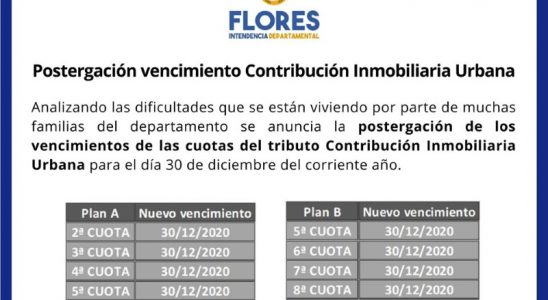 La Intendencia Departamental de Flores informa la postergación del vencimiento de las cuotas de Contribución Inmobiliaria Urbana debido a la situación actual de varias familias del departamento. Las cuotas N°2,…